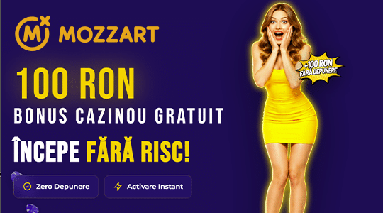 Nu. Bonusul fără depunere de la Mozzart este de 100 RON bani bonus cash, nu rotiri gratuite. Poți folosi cei 100 RON la orice joc eligibil, nu ești limitat la un singur slot. Pentru promoții cu rotiri, verifică ofertele recurente precum Happy Monday, disponibile jucătorilor activi.