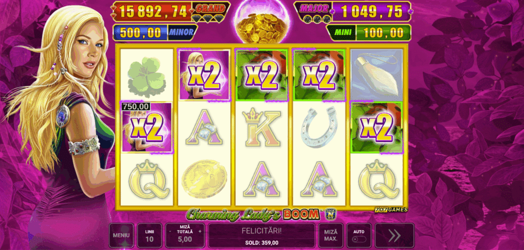 Charming Lady’s Boom are 10 linii de plată fixe, iar câștigurile se formează de la stânga la dreapta ecranului.