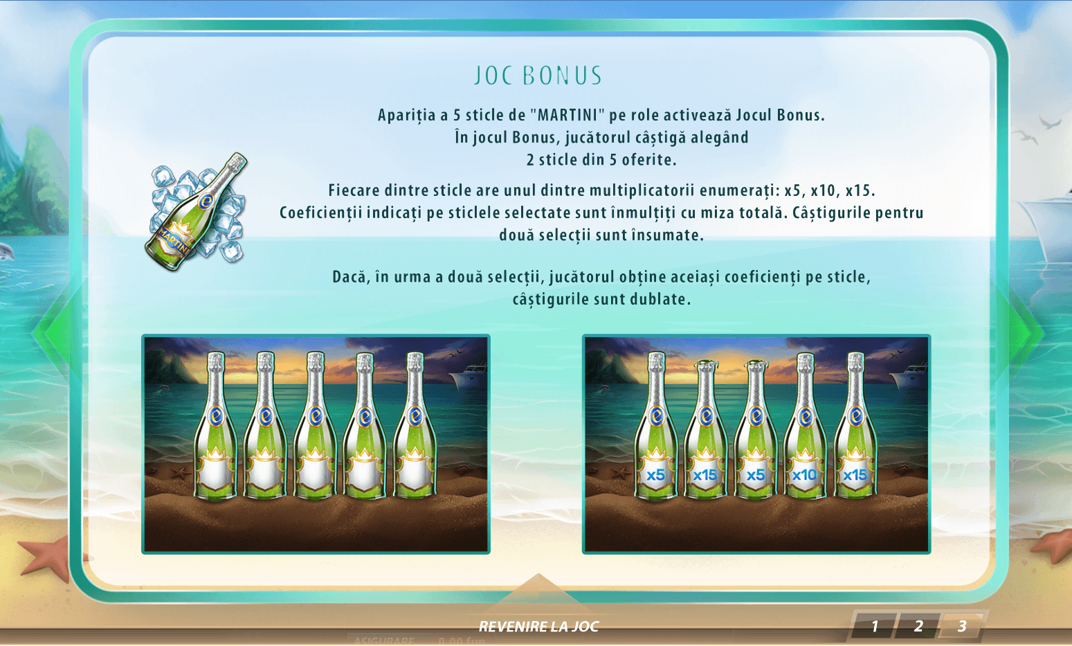 Ai nevoie de 5 simboluri Martini pentru a declanșa jocul bonus, unde poți câștiga prin alegerea a 2 dintre cele 5 sticle. Fiecare sticlă ascunde un multiplicator: 5x, 10x, 15x. Multiplicatorii pe care îi alegi se vor înmulți cu miza totală și îți vor aduce sume finale cu adevărat consistente.