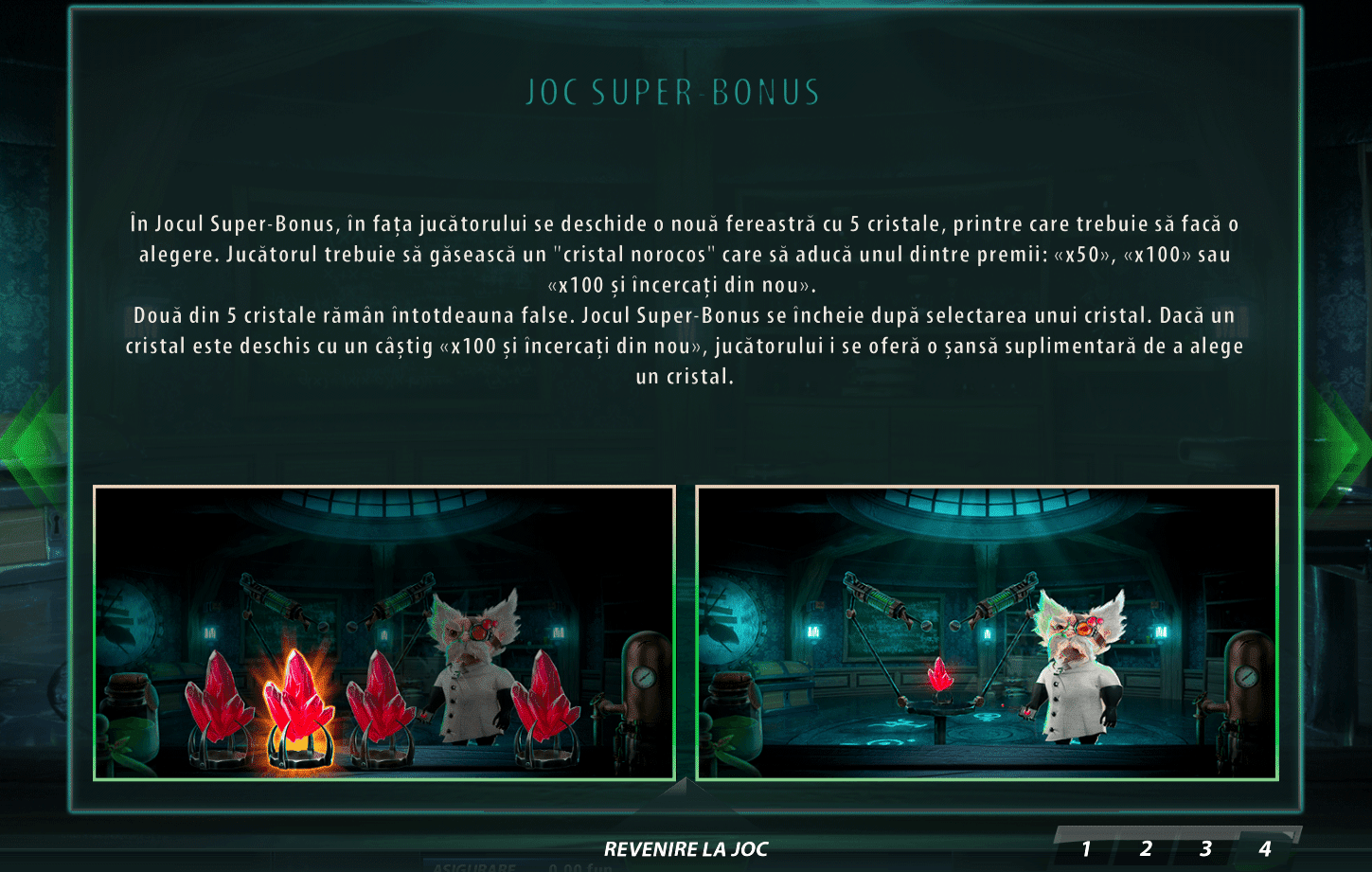 Jocul bonus Wild Alchemist este activat de apariția a 3 simboluri scatter, moment în care pe interfața de joc își fac apariția cinci flacoane, din care tu trebuie să alegi unul. Dacă alegerea este corectă, Alchimistul va continua să toarne cu succes lichidul. Ai o „viață” suplimentară dacă faci o alegere nereușită, grație măștii de protecție a Alchimistului. Dacă toate flacoanele sunt umplute cu succes, atunci vei accesa jocul super-bonus, unde trebuie să selectezi unul dintre cele cinci cristale, care oferă câștiguri de 50x, 100x miza sau opțiunea de a „încerca din nou”. Două dintre cristale sunt false, iar selecția acestora încheie jocul super bonus.